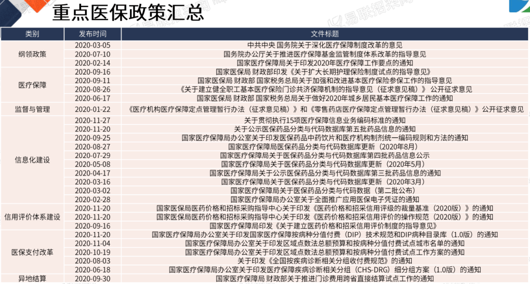 2020年除 醫(yī)保目錄調(diào)整外,醫(yī)保支付改革工作也有重要進(jìn)展, DRG試點(diǎn)工作展開,同時(shí)推出 DIP付費(fèi)方式,相關(guān)試點(diǎn)名單已經(jīng)公布。